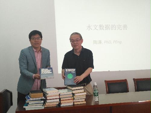陶涛博士从项目实践出发,结合多年研究成果和工作经验,做了“水文数据的完善”报告,重点介绍了水文模型计算、分时段参数优化和实测数据分析等多种手段对比的方法,帮助师生们了解水文数据还原与完善的研究进展,拓展其科学视野。此外,陶博士热心教育公益,不远万里将英文原版专业带回国内,并无偿赠送给学院。